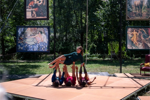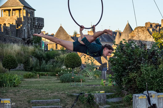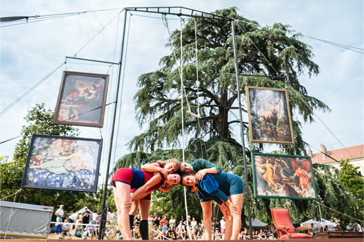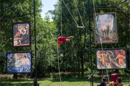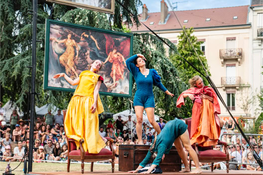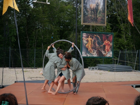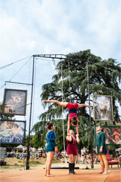« Plus loin, dans le parc de la Verrerie, le propos est davantage féministe. Le cirque est mis au service d’une réflexion sur les Oubliées. Quatre acrobates en sororité luttent contre l’invisibilisation de femmes d’exception : Marie Marvingt, une sportive aventurière et circassienne aux mille exploits, dont le parcours a été trop vite effacée par l’histoire, mais aussi des figures plus proches comme les grands-mères des artistes… Loin des sirènes de la performance physique, celles-ci s’épaulent et prennent appui les unes sur les autres en chanson. Haro sur la rivalité féminine. L’aérien est vécu comme une échappée. Intime et politique mis au service de l’émancipation »