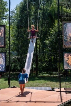 « Plus loin, dans le parc de la Verrerie, le propos est davantage féministe. Le cirque est mis au service d’une réflexion sur les Oubliées. Quatre acrobates en sororité luttent contre l’invisibilisation de femmes d’exception : Marie Marvingt, une sportive aventurière et circassienne aux mille exploits, dont le parcours a été trop vite effacée par l’histoire, mais aussi des figures plus proches comme les grands-mères des artistes… Loin des sirènes de la performance physique, celles-ci s’épaulent et prennent appui les unes sur les autres en chanson. Haro sur la rivalité féminine. L’aérien est vécu comme une échappée. Intime et politique mis au service de l’émancipation »